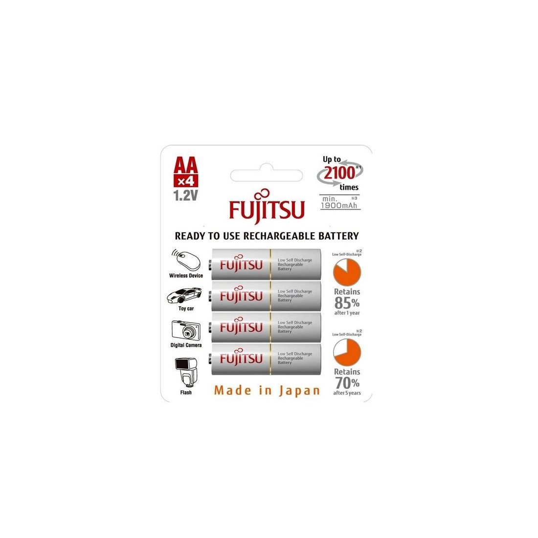 Tehnologia care combinã beneficiile bateriei alcaline cu bateria NiMH, bateria este gata de utilizare imediat dupã achiziționare.2100 de cicluri de încãrcareAuto-descãrcare lenta : 85% din capacitate dupã 12 luni de stocare si 70% din capacitate dupã 60 luni de stocare.Aplicabilitatea la -20 ° CCapacitate: 1900 mAhDimensiune: AAAmbalaj: 4 buc blister