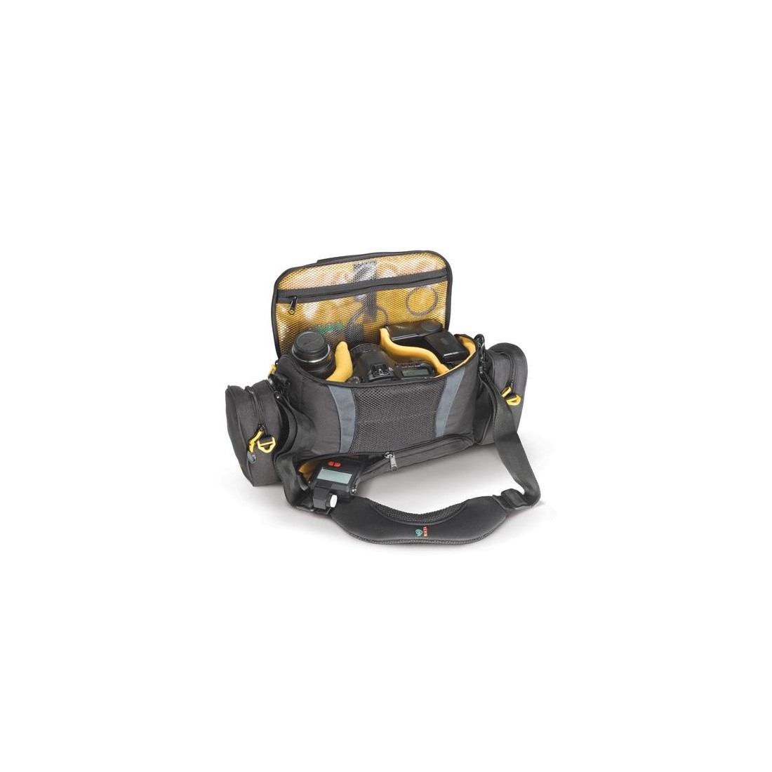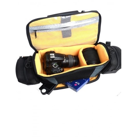 Gazduieste cu succes:     Geanta de umar de dimensiuni medii ideala pentru orice tip de aparat foto DSLR + 1-2 obiective, blitz si multiple accesorii. Un mare avantaj il prezinta buzunarele laterale care sunt detasabile, oferind astfel posibilitatea fotografului de a reduce sau a mari dimensiunea gentii in functie de echipament. Ofera protectie maxima frontala datorita stratului de TST de pe capacul frontal. Manerul este infasurat intr-un manson protector pentru mana atunci cand nu este purtata pe umar.  Interior modular. Observatii: Produsele prezentate in interiorul sau atasate acestui produs, in fotografiile de prezentare ale acestui produs sunt doar cu titlu sugestiv. Nu sunt incluse in produsul oferit spre vanzare. Mai multe informatii despre utilizarea produsului se pot gasi in sectiunea Articole si in sectiunea Prezentare Video, din site.