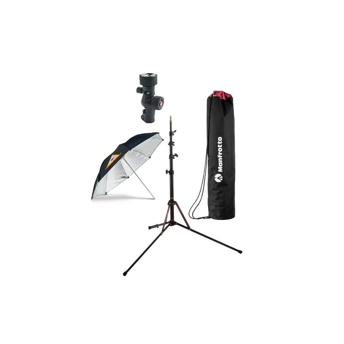 - kit-ul Manfrotto Nanopole cu baza detsabila pentru a fi utilizat ca si undita (boom), cu cap tilt prevazut cu patina universala de blitz, si geanta de transport; (vezi produs aici)- alaturi de o umbrla argintie de 114 cm diametru.