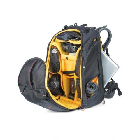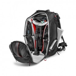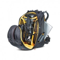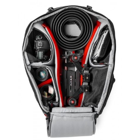 Manfrotto MB PL-PV-610 rucsac foto/video Gazduieste cu succes*:     Rucsacul MB PL-PV-610 este un model versatil, conceput pentru a fi potrivit cu o gama foarte larga de echipamente: camera video HDV precum Sony EX3 (cu sau fara mattbox), un aparat foto VDSLR echipat cu rig sau un aparat DSLR cu un obiectiv de pana la 300 mm atasat, plus 6 sau 8 obiective suplimentare (pana la 500 mm neatasat), un corp aditional si alte accesorii. Accesul la echipamentul principal se face prin partea frontala a rucsacului. Accesoriile pot fi depozitate in cele patru pouch-uri interioare, situate tot in compartimentul principal al rucsacului, acestea deschizandu-se atat din interiorul rucsacului, cat si din exteriorul acestuia. Cele patru pouch-uri se inchid la exteriorul rucsacului cu fermoare de culori diferite, ceea ce usureaza identificarea echipamentului din interior. Intregul sistem de pereti despartitori si pouch-uri din Aeriform permite aranjarea echipamentului in functie de nevoia fiecarui fotograf, iar compartimentul special situat in spatele rucsacului permite depozitarea unui laptop de 17". Trepiedul poate fi atasat si purtat in siguranta in exteriorul rucsacului cu ajutorul suportului special care este livrat cu rucsacul. *Accesoriile foto din imagine sunt cu titlu sugestiv, ele nu sunt incluse la livrare.