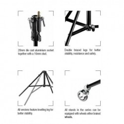 Stativul Manfrotto 008CSU fabricat din otel din 2 sectiuni poate suporta o greutate de pana la 30Kg.Aceste stative sunt echipate cu un suport universal cu "mufa'' (28 mm) Optional se pot comanda roti.